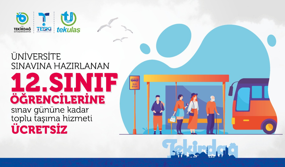 Tekirdağ Büyükşehir Belediyesi’nin Mart 2023 dönemi meclis toplantısında oybirliği ile alınan karar doğrultusunda Tekirdağ il genelinde 12. Sınıf öğrencileri, sınav zamanına kadar şehiriçi ulaşımında aylık 20 kez ücretsiz olarak toplu taşıma araçlarına binebilecekler.