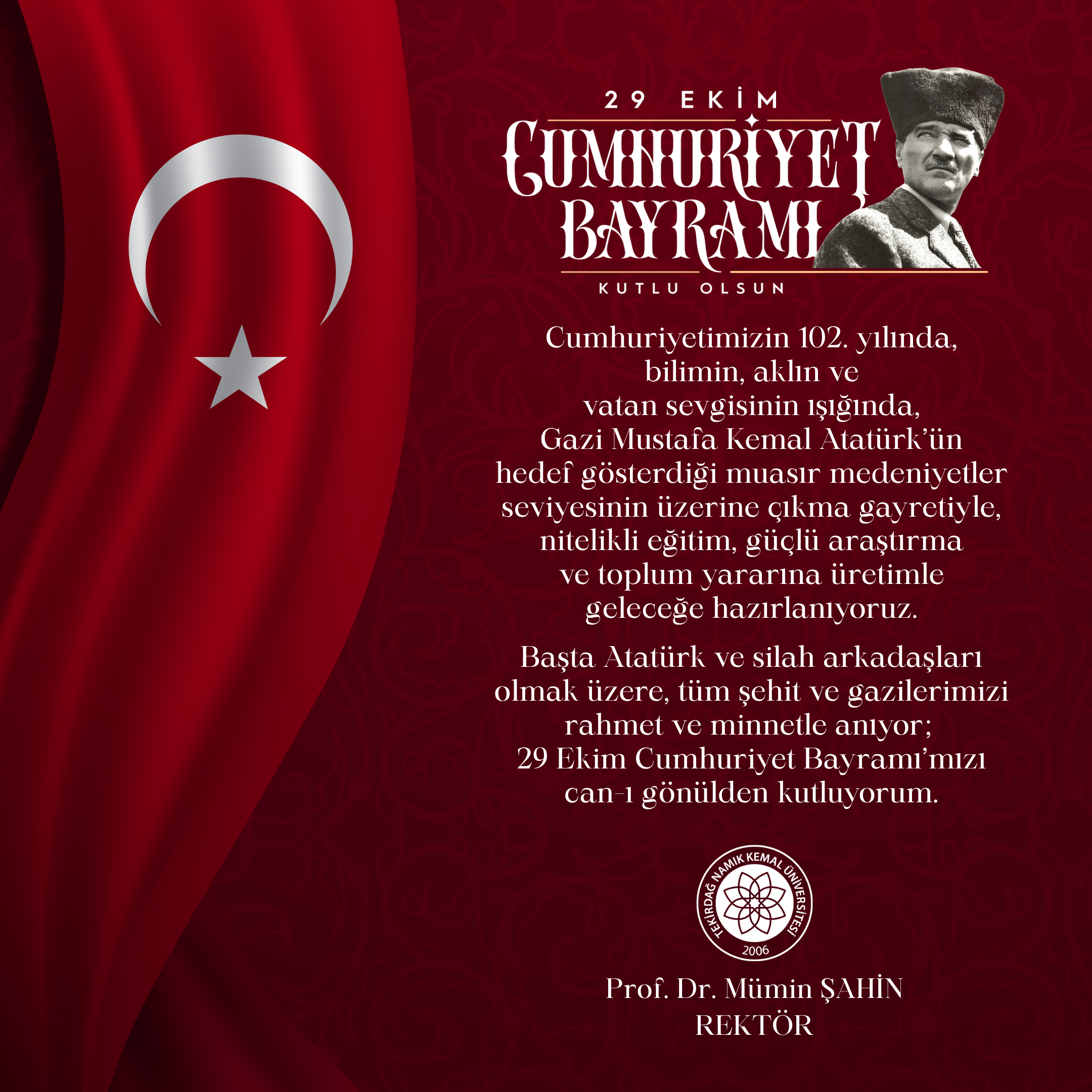 Tekirdağ Namık Kemal Üniversitesi Rektörü Prof. Dr. Mümin Şahin, 29 Ekim Cumhuriyet Bayramı dolayısıyla yayımladığı mesajda, Cumhuriyetin 102. kuruluş yıldönümünü büyük bir gurur ve coşkuyla kutladıklarını belirtti.